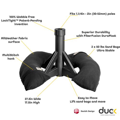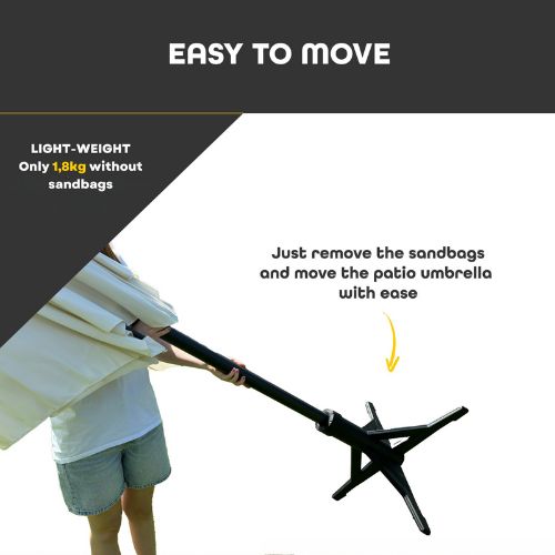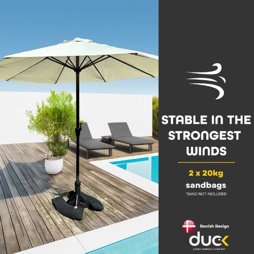 This heavy-duty umbrella base features 2 easy-to-carry 20 kg fillable sandbags for ultimate stability and portability. Its patented locking mechanism ensures a tight, tool-free fit around your umbrella pole – keeping your shade firmly in place, even in windy conditions.